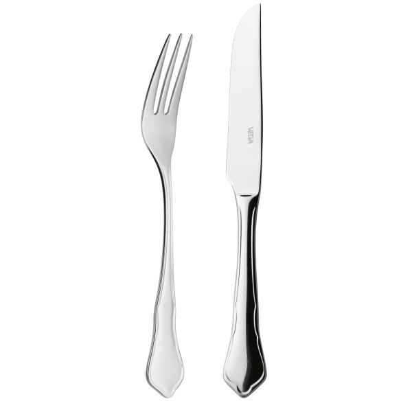 The set consists of six steak forks and steak knives each. A classic in a timeless and familiar shape. The steak knife (mono. 13/0) has a serrated edge. Steak fork: 20.5 cm Steak knife: 22.2 cm Material: Chrome-nickel stainless steel 18/10. Mirror polished and dishwasher safe.