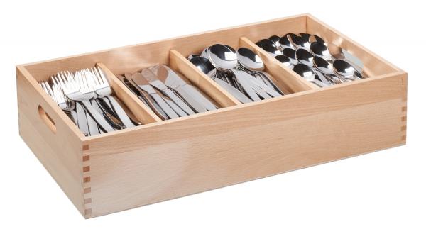 Rectangular cutlery tray made of beech. Four compartments for a total of approx. 240 pieces. With two side accesses for transport. Heavy quality for a firm stand. Notsuitable for dishwashers.