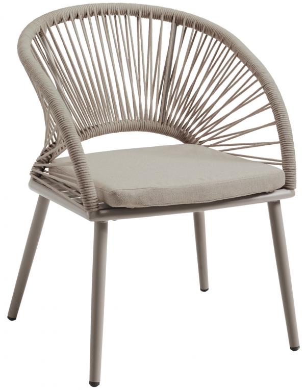 The appealing series Alcamo made of a material mix of Rope combined with powder-coated aluminum spreads a fine elegance in any outdoor area. The series consists of chairs and armchairs which can be combined with each other for dining or lounge area. Available in a natural harmonious beige tone, or in trendy anthracite, this seating furniture attracts attention and is also weather resistant and very easy to clean. Dirt can be easily removed with a damp cloth. The hard-wearing Rope wickerwork is a visual highlight due to its fan-shaped arrangement and guarantees a high level of seating comfort. In addition, a matching back cushion can be ordered.