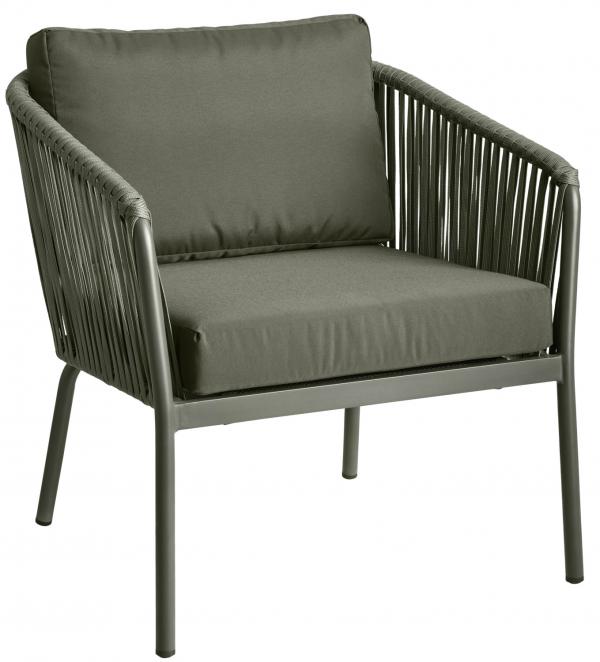 Modern outdoor armchair made of attractive material mix of aluminum and Rope wicker. Very comfortable and sturdy. Delivered assembled. Incl. seat and back cushions made of olefin fabric (100% polypropylene). * For outdoor use. * Thickness of the seat cushion: 10 cm * Dimensions of the back cushion: 40x60x16 cm (WxHxD) Frame: powder coated aluminum. Seat: Rope wicker (15 mm wide).