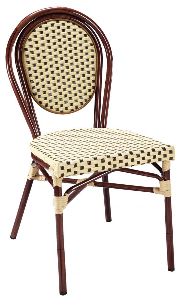 Modern bistro chair made of plastic wickerwork. Frame made of powder-coated aluminium in bamboo look (Ø frame: 2.2 cm, material thickness 1.2 mm). Suitable for outdoor use. Seat 41x42 cm, seat height 44 cm. Weight 3.4 kg. Stackable.