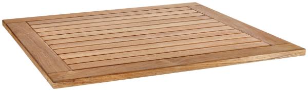 The teak tabletop Luigi in square form is a timeless classic for your outdoor equipment. The tabletop consists of solid untreated teak and is designed in a typical form with a continuous frame and parallel wooden slats on the inside. Teak is very robust and naturally rich in oil. Therefore it is not necessary to oil teak furniture. The wood is extremely weatherproof and UV-resistant, but develops a typical silver patina over time. The wooden table top fits to all table columns of our assortment and can easily be mounted to them. * square tabletop for outdoor use * made of solid teak wood in reliable design * untreated teak wood, we recommend the use of teak oil to fully protect your teak furniture * fits to the table columns in our assortment * simple attachment to the table column, please follow the instructions * weatherproof and UV-resistant solid wood panel * develops a typical patina when in the outdoor area, which does not mean a lack of quality The teak table top Luigi square is a rustic and elegant eye-catcher. Thanks to its durable and weatherproof properties, teak is perfectly suited for outdoor use. The development of the typical, silvery teak patina can be prevented by regular care with the teak care set, which you can also order. For the best stability of the tables during assembly, please follow the instructions and the maximum permissible tabletop size for the selected table column.