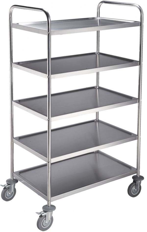 Robust trolley made of stainless steel. 5 shelves each with 27,5 cm spacing and a storage space of 74x44 cm. Material thickness of the floors 0.8 mm, the pipes 0.9 mm. Maximum load limit 50 kg per board. 4 smooth-running wheels with Ø10 cm, 2 of them with parking brake. Total weight 27 kg.