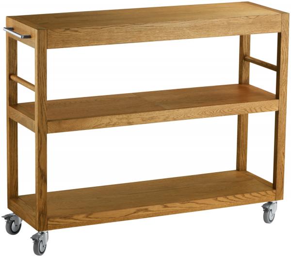 With the exclusive Odisseo serving trolley you can transport crockery, cutlery and much more safely and professionally. Its high-quality frame is made of solid oak wood, the handles are made of stainless steel. Two small and two large shelves offer enough space to store everything you need. The soft-tread wheels are quiet and easy on your floor. * serving trolley for gastronomy, already assembled * frame made of solid oak, shelves veneered with real wood * stainless steel handles, 20.5 cm long * with two small (32.5 x 53 cm, 1/1 GN) and two large (32.5 x 106 cm, 2/1 GN) shelves: large shelf area * shelves dimensions: 32.5 x 53 cm (1/1 GN) and 32.5 x 106 cm (2/1 GN) * maximum load 40 kg per level * Wheels with soft running surface (quiet and gentle to the floor), diameter 8 cm * easy-care and sturdy * can be combined with all GN-based products in our assortment * can be combined with all buffet inserts (wooden boards, carafe holders, bottle holders) on the basis of the base tray, matching adapter frame made of oak wood is best to be ordered at the same time The Odisseo serving trolley can ideally be combined with many other products from our range. So all articles with GN dimensions fit with the trolley. With the help of an adapter frame (please order separately), buffet inserts based on our basic tray, such as wooden boards, carafe holders or bottle holders, also fit the service trolley. Odisseo is a stylish helper in everyday gastronomy, which will soon be indispensable for you.