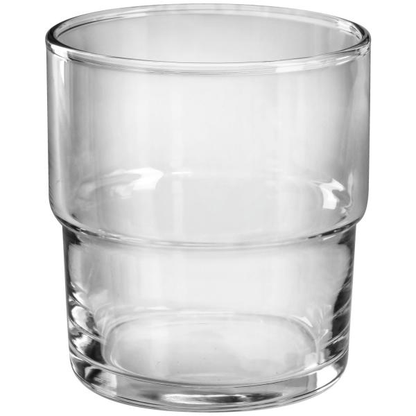 Drinking glass made of tempered glass. Stackable and dishwasher safe.