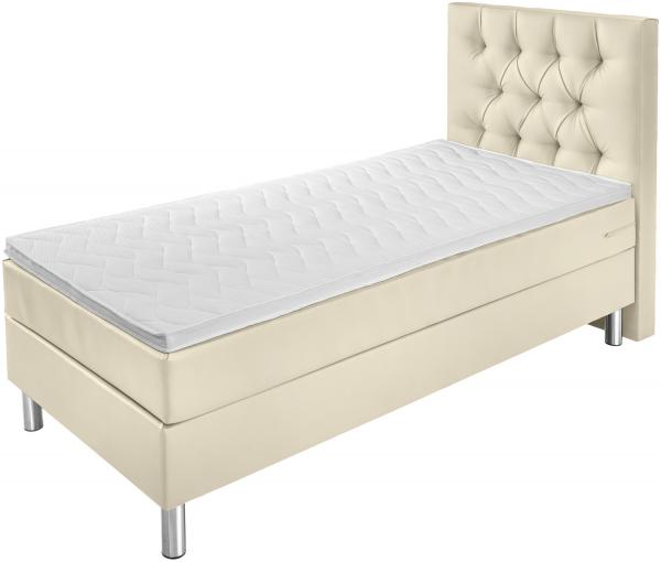 Box spring bed in a practical complete set. Box with pocket springs. Solid wood frame. 7-zone pocket spring mattress. Gel foam topper for comfortable sleep. Headboard with classic Chesterfield quilting. Silver steel feet. Height for getting into bed: 69Â cm. Height: Feet 16Â cm + box 27Â cm + mattress 21Â cm + topper 5Â cm; total height: 69Â cm. With imitation leather cover. Available as a single or double bed. Supplied with connecting elements.