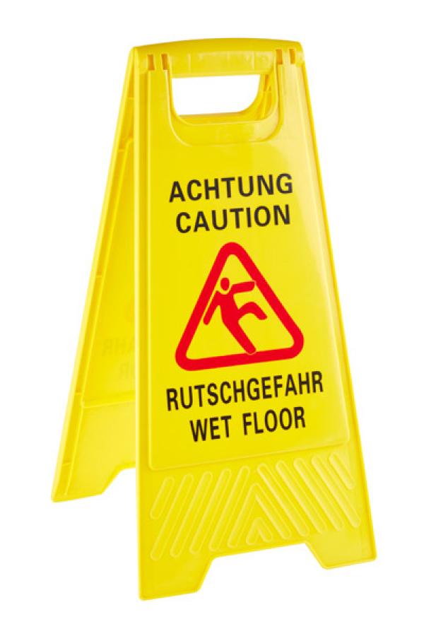 The "slip hazard" display is made of polypropylene and is suitable for warning your guests about wet, slippery floors. Foldable for space-saving storage. Lettering in German and English.