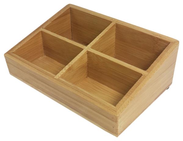 Made of bamboo. The bamboo was treated against water, so the additional tray with the four compartments is water resistant. The tray is equipped with four protective pads. Easy to clean. Matching main tray can be ordered at www.lusini.com.