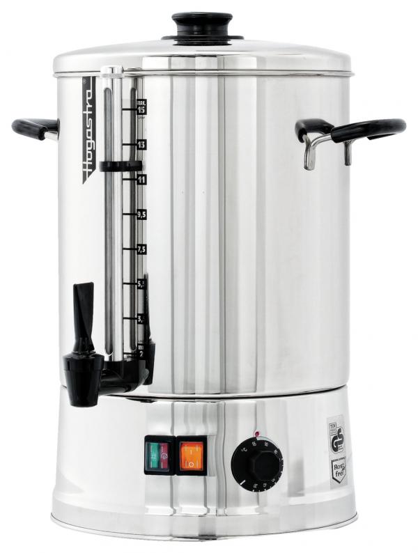 High-performance hot water machine made of 18/10 stainless steel. Can provide up to 15 liters of water per hour. Heat-up time approx. 20 minutes. A practical tap allows cups or jugs to be filled quickly. A sight glass indicates the amount of water left. Power: 2000 watts, capacity 2 - 15 liters, illuminated on/off switch, indicator light: heating phase red or holding phase green. With manually adjustable temperature control, stainless steel underfloor heating for temperatures between 30 °C and 95 °C.
