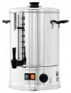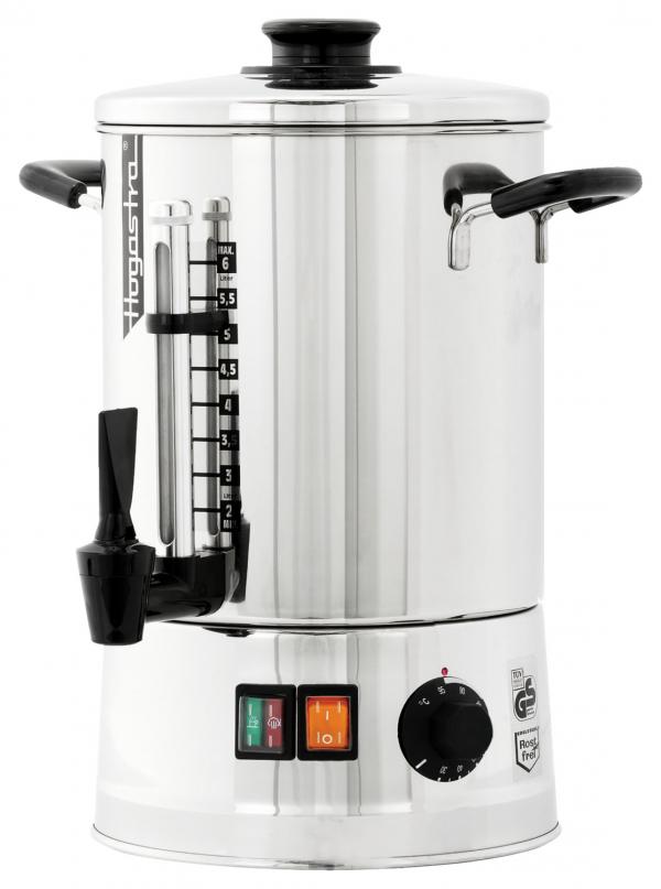 High-performance hot water machine made of 18/10 stainless steel. Can provide up to 15 liters of water per hour. Heat-up time approx. 20 minutes. A practical tap allows cups or jugs to be filled quickly. A sight glass indicates the amount of water left. Power: 2000 watts, capacity 2 - 6 liters, illuminated on/off switch, indicator light: heating phase red or holding phase green. With manually adjustable temperature control, stainless steel underfloor heating for temperatures between 30 °C and 95 °C.
