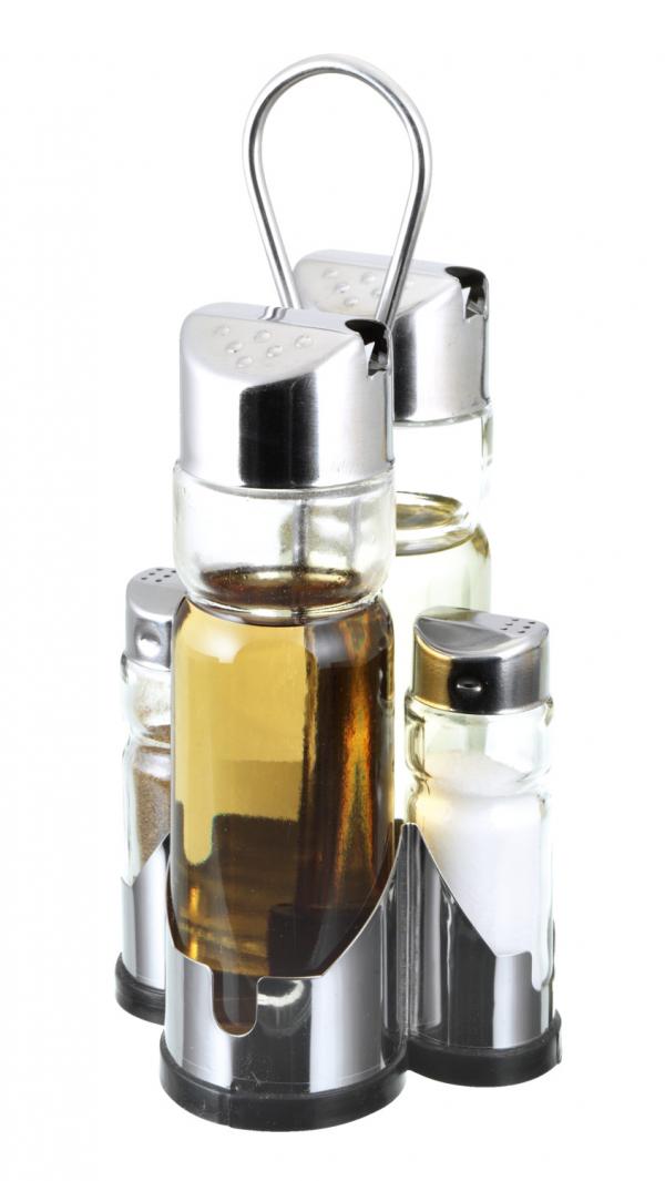 Shapely cruet for vinegar, oil, salt and pepper. Drip-free and very stable, made of glass and chrome stainless steel 18/0, rustproof. Capacity for vinegar and oil each 0,175 l. Suitable for dishwashers.