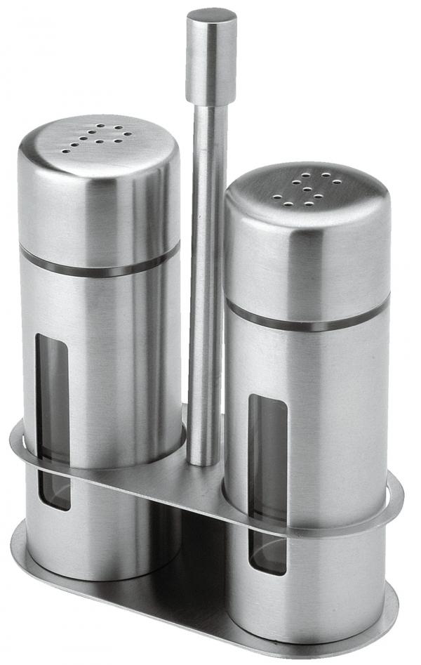 3-piece salt and pepper cruet stand set made of of brushed chrome steel 18/0 in combination with plastic. Dishwasher safe!