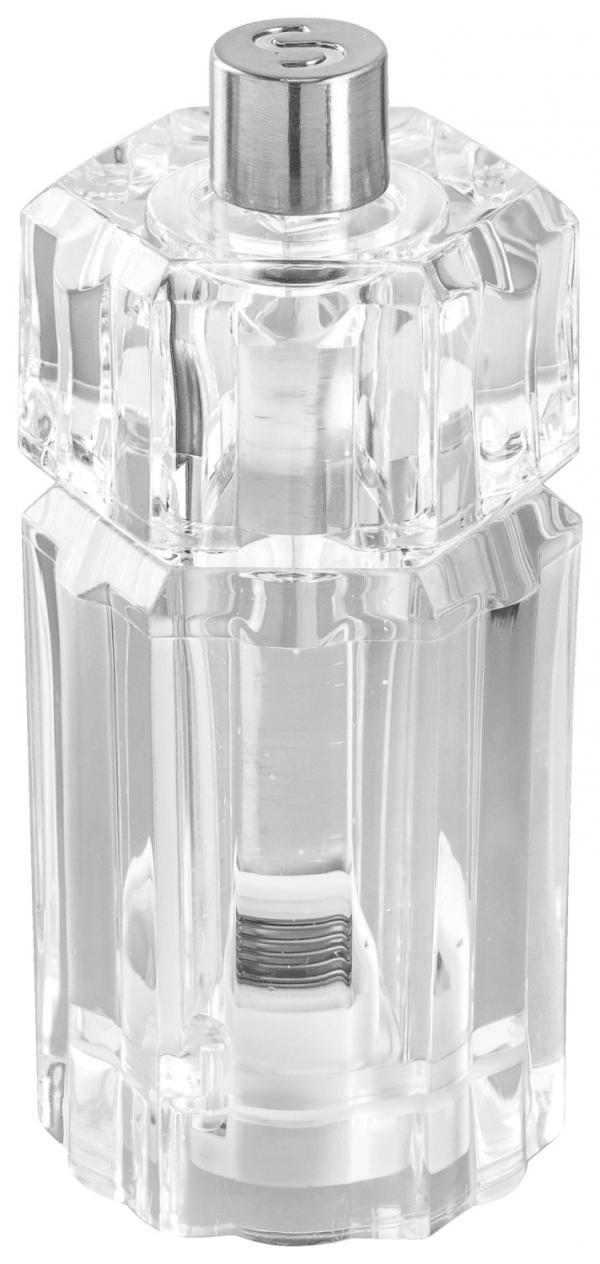 Salt mill made of transparent acrylic glass. It has a particularly light and durable ceramic grinder. The content is marked with an "S" on the adjustment screw at the top.