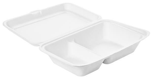 With attached hinged lid and practical partitioning. Made from high-quality, environmentally friendly bagasse, a waste product of sugar production. Easily biodegradable under controlled composting conditions. Certified according to EN13432. Stackable, waterproof, fat resistant, heat and cold resistant, microwaveable up to 100 °C.