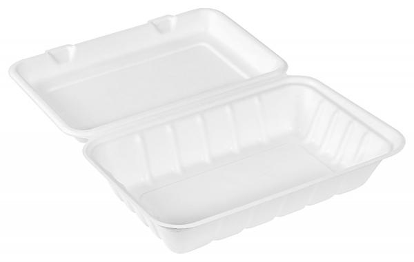 With attached hinged lid. Made from high-quality, environmentally friendly bagasse, a waste product of sugar production. Easily biodegradable under controlled composting conditions. Certified according to EN13432. Stackable, waterproof, fat resistant, heat and cold resistant, microwaveable up to 100 °C.