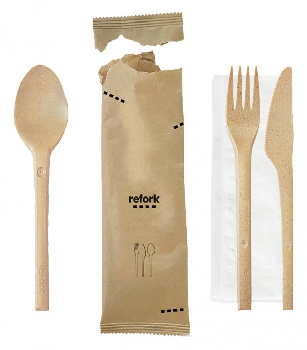 Set consisting of knife, fork, spoon and napkin. ReFork offers a green solution to the global plastic problem. The unique wood material. It is made entirely from elements already present in nature, leaving no permanent microplastics. The main ingredient is wood flour, a waste product from industrial wood processing, which is filtered and freed from impurities. As a binder, ReFork uses a naturally occurring polymer produced by microorganisms through fermentation processes. Refork adds naturally occurring and renewable mineral additives to enhance the properties of our material. * With high user comfort * For food up to 100°C