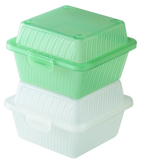 Reusable polypropylene burger box. Ideal for takeout use — the sustainable alternative to disposable packaging. Dishwasher safe. Stackable, robust, BPA-free. Can reliably withstand temperatures between -40 °C and +80 °C.
