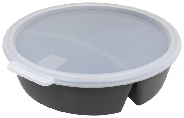 Reusable 2-compartment (350 ml + 750 ml) menu container with lid made of bio-based plastic and wood fibers. The lid has an integrated slot for labels and seals to prevent leaks. Provides reliable temperature resistance between -20°C and +100°C. Stackable in compact form, recyclable, suitable for industrial dishwasher, microwaveable (simply turn lid), BPA-free, melamine-free.