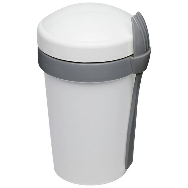 The reusable organic travel cup for vegetables is a real all-rounder. It features an innovative fresh container system and a screw-on lid with sealing ring. For example, you can prepare vegetable sticks and 2 different dips for eating on the go. There is a small flap for holding the fork — so it`s always to hand. Suitable for dishwashers, BPA-free, organic PE made from renewable raw materials with a positive carbon footprint (sugar cane), 100% recyclable, made in Germany. For orders over 500 cups, we can apply a custom logo.