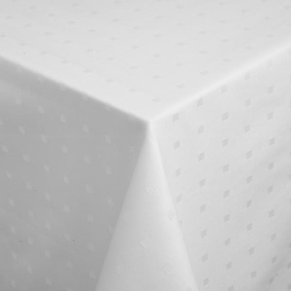 White jacquard table linen with subtle cube pattern, durable quality, ideal for everyday use. Yardware available in 280 cm width. Damask fabric made of 100% cotton, mercerized, 95 °C wash, chlorine-resistant, weight 190 g/m².