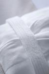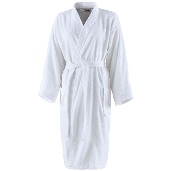 100% cotton, 360 g/m², 95 °C wash, boilproof and chlorine resistant. White walk terry kimono bathrobe with two patch pockets and belt. Tumble dry possible. Suitable for men and women.