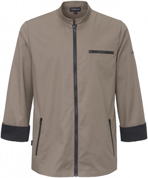 Fashionable men`s chef jacket in long sleeve, with contrast zipper in the front center, breast pocket with contrast zipper and cuff in the contrast color. Material: 65% polyester, 35% cotton, 200 g/sqm. 60°C wash. Back length: 77 cm at size 50.
