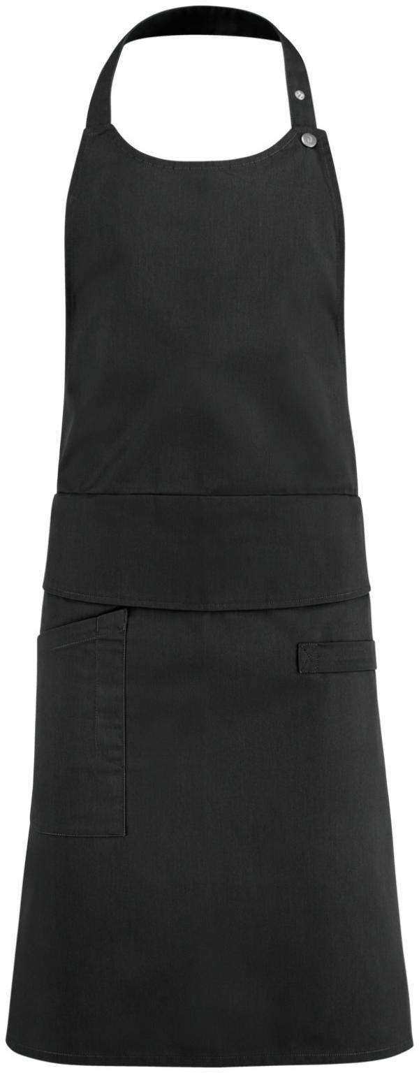 65% polyester, 35% cotton. 200 g/m². 60°C wash. Elegant bib apron with a round neckline made from a smooth, easy-care blended fabric. With a simple, elegant and flexible belt system. Individually adjustable and comfortable for any fit thanks to elastic bands with snap buttons to fix the set width. The fabric cover perfectly conceals the adjustable elastic belt. With a practical clip fastener at the back of the waist to quickly close and open the apron. With patch pocket on the side including pen pocket and tea towel loop. The neck strap can be adjusted in length using snap buttons. Pocket dimensions: 19.5 x 22.5 cm (WxL).