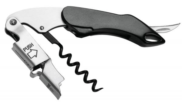 Stainless steel with black plastic handle. The spiral is coated with Teflon. The corkscrew with double lever push function enables safe uncorking with little effort.