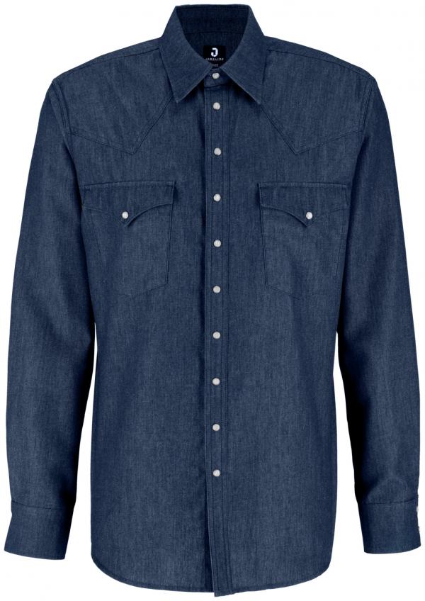 74% cotton, 26% polyester. 135 g/m². 40°C wash. Modern men`s shirt in western style with tapered shoulder and back yoke, as well as a classic shirt collar. With two patch chest pockets, cuffs at the sleeve hem and rounded hem. Medium button placket, as well as cuffs and chest pockets with mother-of-pearl-look snap buttons. Slim fit cut. Thanks to the high cotton content, the shirt will take on its typical and unmistakable denim used look over time. Back length: 78 cm for size 39/40.