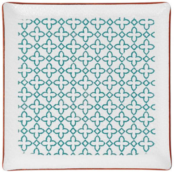 Glass platter with turquoise pattern. Dishwasher safe.