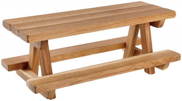 Food board in a mini bench style, made of solid oak, oiled. With two levels to present food. Easy-care. Not suitable for dishwasher.
