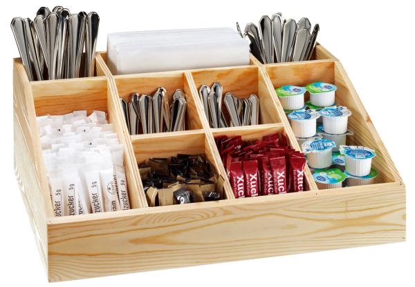 Praktičan organizator bifea od drveta smreke. Idealno za kapsule za mlijeko, tube šećera, salvete, priboro za jelo ili kesice za čaj na bifeu. Pogodan i za pivsku baštu ili druge zaštićene vanjske prostore. Visina sprijeda 6,5 cm, a stražnji zid ima visinu od 14,5 cm. Preporučuje se ručno čišćenje. Nije pogodno za mašinu za pranje sudova.