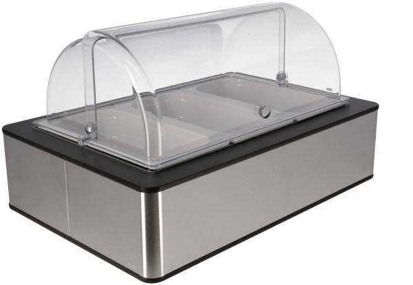 Set se sastoji od kutije visokog kvaliteta izrađene od visokokvalitetnog brušenog 18/10 nehrđajućeg čelika sa laminatnim poklopcem boje antrakita, osnovnog kontejnera izrađenog od visokokvalitetne plastike sa toplotnom otpornošću do 70°C, odgovarajućeg hladnog pakovanja napravljenog od polietilena, 3x bijele, 6.5 cm dubok.