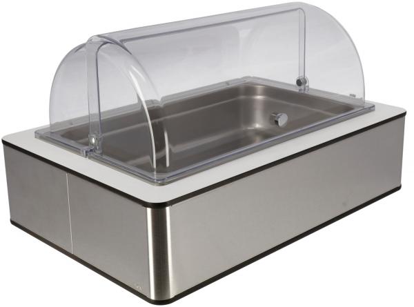 Set se sastoji od kutije visokog kvaliteta izrađene od visokokvalitetnog brušenog nehrđajućeg čelika 18/10 s bijelim laminatnim poklopcem, osnovnog spremnika izrađenog od visokokvalitetne plastike s toplotnom otpornošću do 70°C, odgovarajućeg hladnog paketa izrađenog od polietilena, 10 cm dubokog GN spremnika izrađenog od 18/10 hroma.nikl nehrđajući čelik.