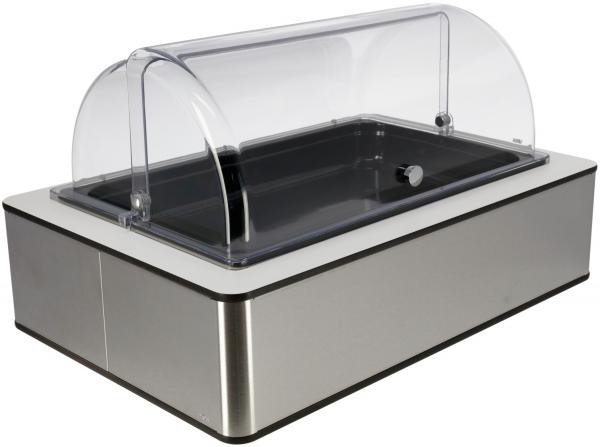 u modernom dizajnu. Set se sastoji od kutije visokog kvaliteta, brušenog nerđajućeg čelika 18/10 sa belim laminatnim poklopcem, osnovnog kontejnera od visokokvalitetne plastike sa toplotnom otpornošću do 70°C, odgovarajućeg hladnog pakovanja napravljenog od polietilena, crnog, 6.5 cm dubok, slagan, udar i otporan na lomljenje GN kontejner 1/1 napravljen od melamina (raspon primjene: -30°C do +70°C).
