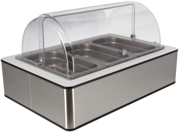 Set se sastoji od buffet kutije visoke izrađene odnehrđajućeg čelika 18/10 sa bijelim laminatnim poklopcem, osnovnog kontejnera, odgovarajućeg hladnog paketa izrađenog od polietilena, 3x 6.5cm duboki GN kontejner 1/3 izrađen od hrom-nikla 18/10 nehrđajućeg čelika s praktičnom iglom za slaganje, ojačanim uglovima i rubovima i litarskom skalom i nelomljivim poklopcem rolnog vrha Sturgis izrađen od visokokvalitetnog tritana (bisfenol A-free) sa neklizajućim zaustavljajućim gumenim premazom za tiho otvaranje i zatvaranje.