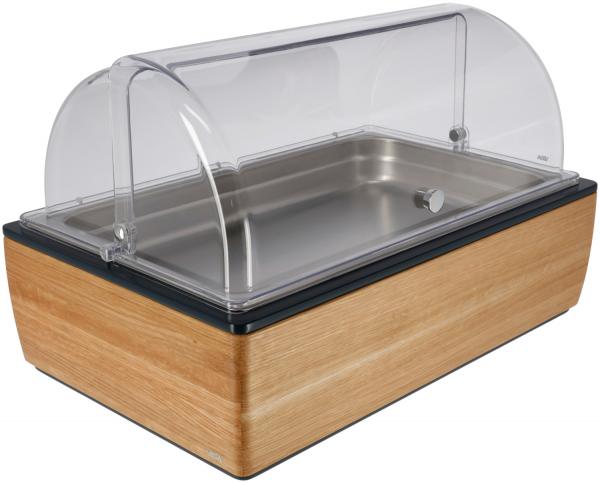 Set se sastoji od bife kutije visoke izrađene od čvrstog hrasta sa antracitnim MDF panelom, osnovnog kontejnera od visokokvalitetne plastike sa toplotnom otpornošću do 70°C, odgovarajućeg hladnog pakovanja napravljenog od polietilena, 6.5 cm dubok.