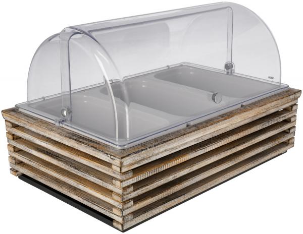 Set se sastoji od bife kutije od čvrstog drveta, osnovnog kontejnera od visokokvalitetne plastike sa toplotnom otpornošću do 70°C, odgovarajućeg hladnog pakovanja od polietilena, 3x bijelog, 10 cm dubokog.
