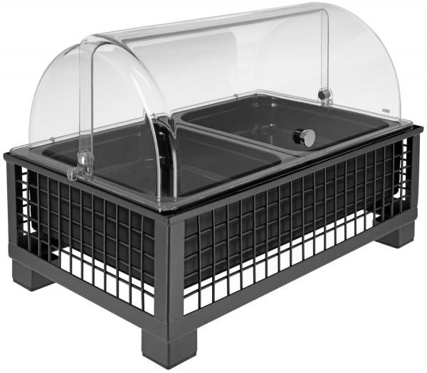 Set se sastoji od složene bife kutije visoke izrađene od čelika obloženog prahom, osnovnog kontejnera izrađenog od visokokvalitetne plastike sa toplotnom otpornošću do 70°C, odgovarajućeg hladnog pakovanja od polietilena, 2x crnog, 6.5 cm dubok, slagan, udar i otporan na lomljenje GN kontejner 1/2 izrađen od melamina (raspon primjene: -30°C do +70°C).