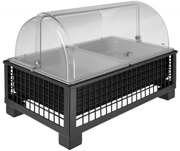Set se sastoji od složene bife kutije visoke izrađene od čelika obloženog prahom, osnovnog kontejnera izrađenog od visokokvalitetne plastike sa toplotnom otpornošću do 70°C, odgovarajućeg hladnog pakovanja napravljenog od polietilena, 2x bijelog, 6.5 cm dubok, slagan, udar i otporan na lomljenje GN kontejner 1/2 izrađen od melamina (raspon primjene: -30°C do +70°C).