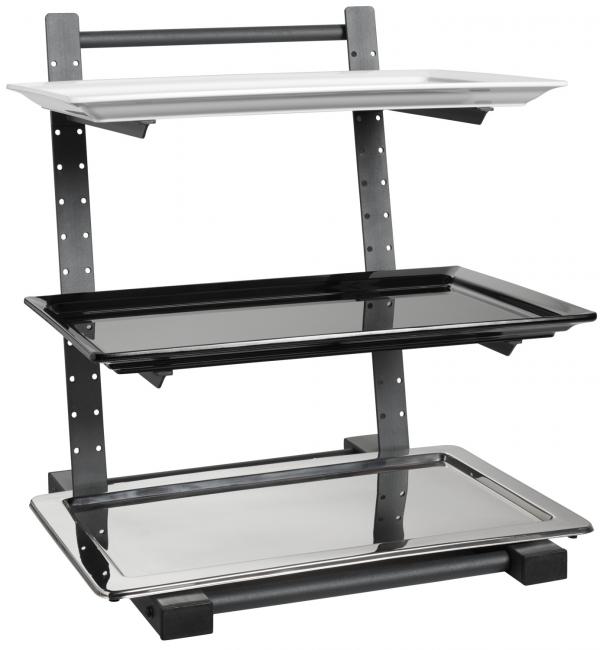 Paletni stalak od čelika lakiranog prahom. Neklizajuće potporne šine. Podesiva visina za različite kutije ili tanjire. Pored Portland bife kutija, paletni stalak može da primi bilo koje GN 1/1 tanjire i GN 1/1 i 60x40 cm palete (bez nogu), kao i Wantage ili Montana bife kutije. Paletni regal se isporučuje rastavljen, laka montaža. Četiri konzolna kraka su već uključena u isporuku. Nije pogodno za mašinu za pranje sudova.