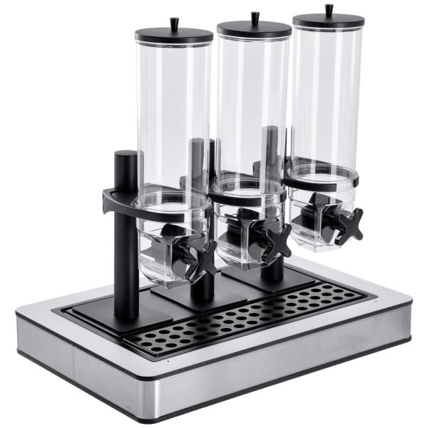 Set za doziranje žitarica se sastoji od bife kutije 1/1 od visokokvalitetnog, brušenog nerđajućeg čelika 18/10 sa poklopcem od belog laminata, donjeg kontejnera od visokokvalitetne plastike otpornosti na toplotu do 70°C i trostruki Hamshire dozator napravljen od posebno otpornog na lomljenje i ogrebotine Tritan (bez bisfenola A) u sopstvenom dizajnu. Kapacitet 3x 4 litara. Udaljenost između baze i žlijeba je pribl. 10 cm. Sa silikonskim točkom za doziranje glatkog pokreta, uklonjivim, hermetičkim poklopcem i posudom za kapanje od nerđajućeg čelika 18/10. Dozator se isporučuje sastavljen. Posuda za kapanje je pogodna za mašinu za pranje sudova, svi ostali delovi nisu.
