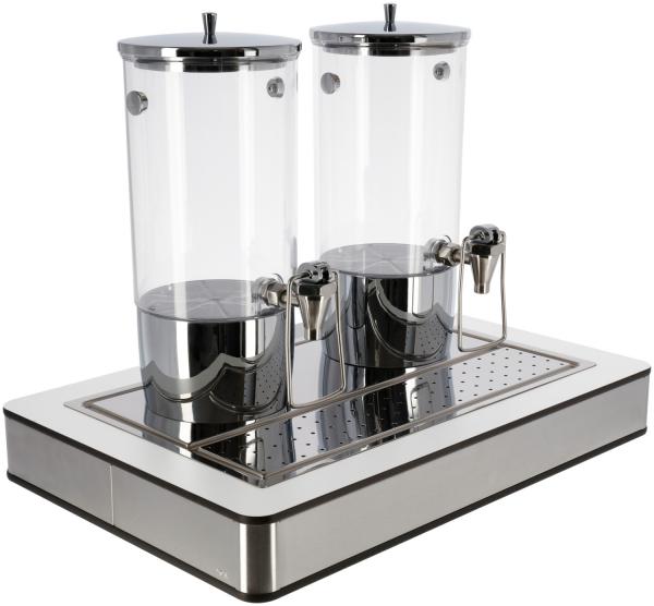 Set se sastoji od buffet kutije ravne 1/1 izrađene od visokokvalitetnog brušenog 18/10 nehrđajućeg čelika sa bijelim laminatnim poklopcem, osnovnog spremnika izrađenog od visokokvalitetne plastike sa toplotnom otpornošću do 70°C i dozatora Hampton dvostrukog izrađenog od posebno otpornog na lomljenje i ogrebotine.rezistentni trican (bisfenol A-free). Kapacitet 8 litara.