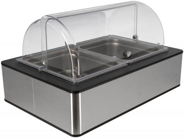 Set se sastoji od buffet kutije visoke izrađene od visokokvalitetnog brušenog 18/10 nehrđajućeg čelika sa laminatnim poklopcem boje antrakita, osnovnog kontejnera izrađenog od visoko kvalitetnog brušenog čelika.kvalitetna plastika sa toplotnom otpornošću do 70°C, odgovarajuća baterija za hlađenje izrađena od polietilena, 2x 10 cm duboki GN kontejner 1/2 izrađen od 18/10 hrom-nikla nehrđajućeg čelika.