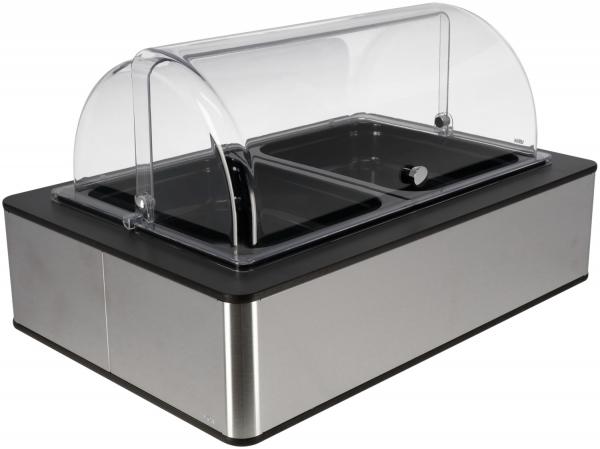 Set se sastoji od bife kutije visoke izrađene od visokokvalitetnog brušenog 18/10 nehrđajućeg čelika sa laminatnim poklopcem boje antrakita, osnovnog kontejnera izrađenog od visokokvalitetne plastike sa toplotnom otpornošću do 70°C.