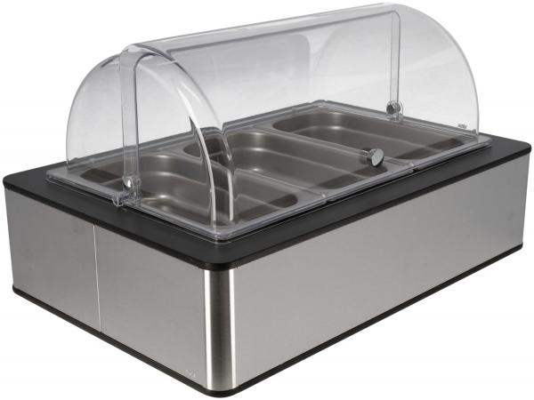 Set se sastoji od kutije visokog kvaliteta izrađene od visokokvalitetnog brušenog 18/10 nehrđajućeg čelika sa antracitnim laminatnim poklopcem, osnovnog kontejnera izrađenog od visokokvalitetne plastike sa toplotnom otpornošću do 70°C, odgovarajućeg hladnog paketa izrađenog od polietilena, 3x 6. GN kontejner je siguran za pranje sudova, svi ostali delovi nisu.