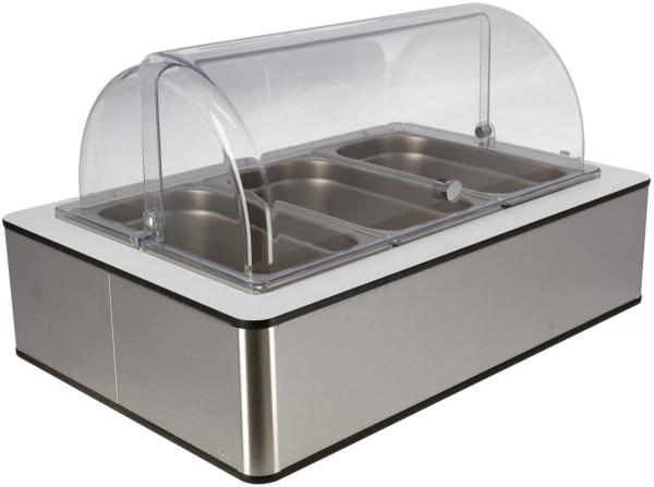 Set se sastoji od buffet kutije visoke izrađene od visokokvalitetnog brušenog 18/10 nehrđajućeg čelika sa bijelim laminatnim poklopcem, baznim kontejnerom napravljenim od visokog...kvalitetna plastika sa toplotnom otpornošću do 70°C, odgovarajući hladni paket napravljen od polietilena, 3x 10 cm duboki GN kontejner 1/3 izrađen od 18/10 hrom-nikl nehrđajućeg čelika.