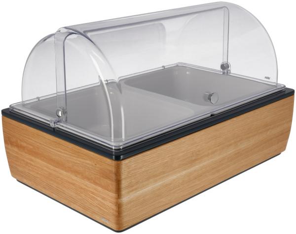 Set se sastoji od buffet kutije visoke izrađene od čvrstog hrasta sa MDF panelom u boji antracita, baznog kontejnera napravljenog od visokog...kvalitetna plastika sa toplotnom otpornošću do 70°C, odgovarajući hladni paket napravljen od polietilena, 2x bijeli, 10 cm dubok, slagan, udarni i lomljivi GN kontejner 1/2 izrađen od melamina (raspon primjene: 30°C do +70°C).