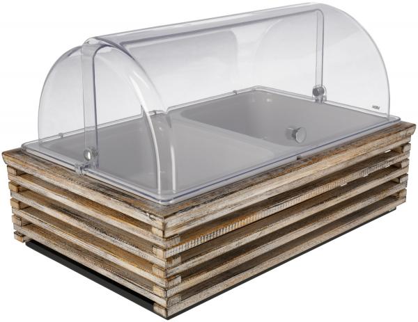 Set se sastoji od bife kutije od čvrstog drveta, osnovnog kontejnera od visokokvalitetne plastike sa toplotnom otpornošću do 70°C, odgovarajućeg hladnog pakovanja napravljenog od polietilena, 2x bijelog, 10 cm dubokog, slaganog, udarca i lomljenja.