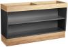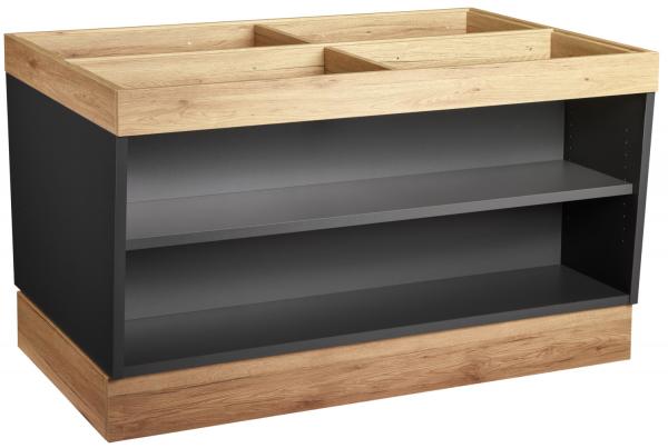 Buffet table made of derived timber products. This table can be perfectly combined with all our buffet accessories modular. The island element can be perfectly placed in the middle of a room. The three different insert plates (closed plate, insert for GN platters, attachment for the separate Dish Fenton GN 1/1), the hygienic protection, as well as the optional niche wall are available separately. The bottom and the four inserted shelves (10 different heights adjustable) in the body perfectly serve as storage space for additional plates, cups, etc. Inside the table is a cable opening and serves as a feed or drain for power cables or water pipes. The tables are also equipped with 4 height-adjustable pedestal glides. Robust. Durable. Easy to clean.